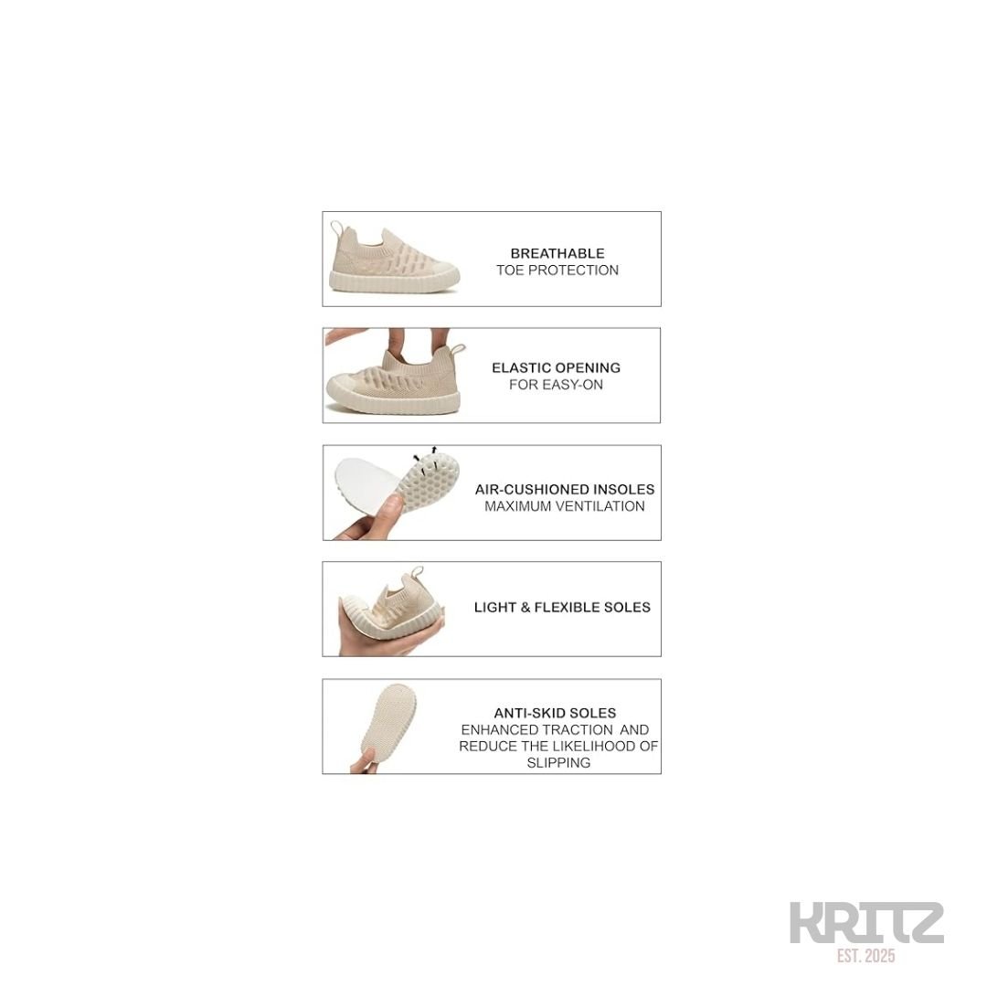 These soft slip-on baby shoes are designed to keep little feet comfortable, fresh, and supported all day. Made with breathable knitted fabric and a flexible anti-slip sole, they help babies move naturally while crawling, standing, and taking first steps. The lightweight sock-style design makes them easy to wear and remove, while the neutral beige color matches any baby outfit perfectly.